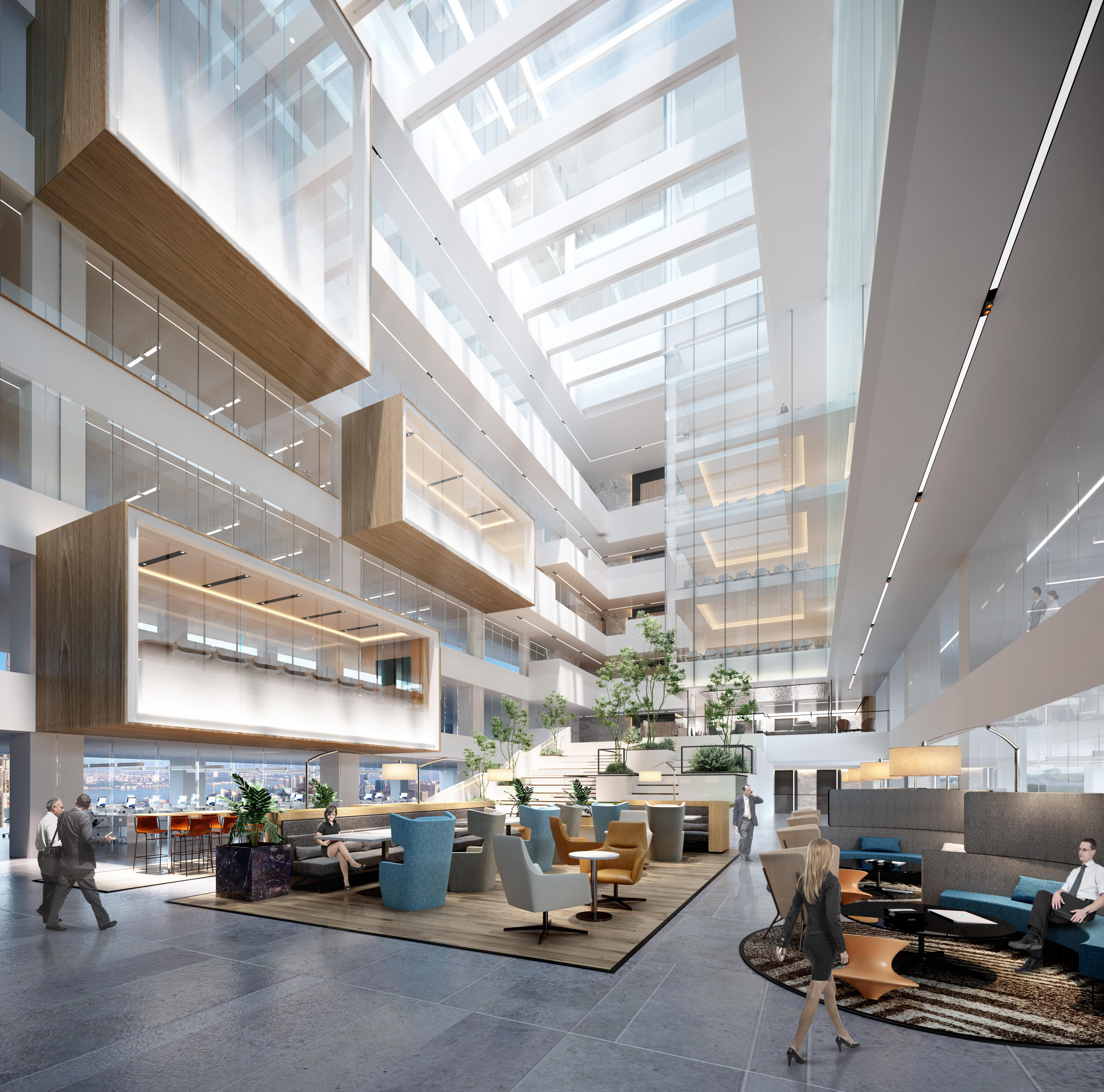 在楼内空间上,精心布置了内部空间序列。聚焦城市会客厅空间的打造,通过打通楼板,将屋顶采光引入;设置环中庭会议及公共交往空间,形成高效、灵动的建筑内部氛围。
