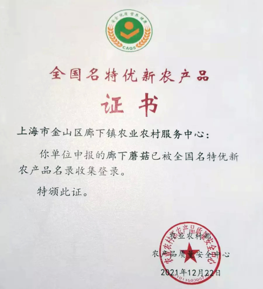 廊下蘑菇被农业农村部农产品质量安全中心评定为“全国名特优新农产品”。