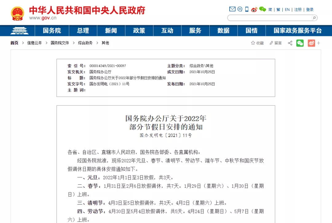 国务院已经发布了2022年的假期安排,春节依然是7天。