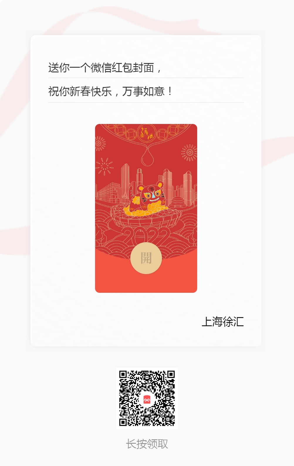 关注上海徐汇微信公众号并在后台留言“红包”,即可获得红包封面领取二维码