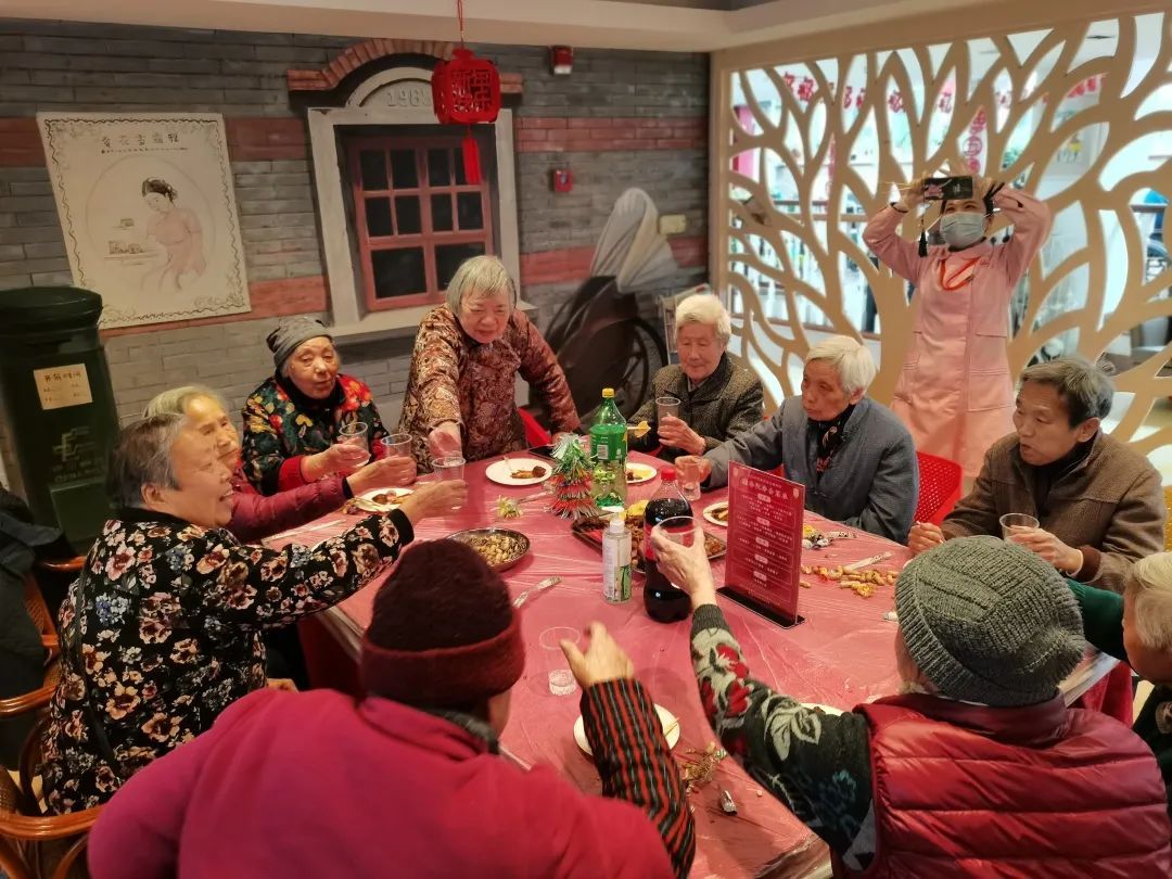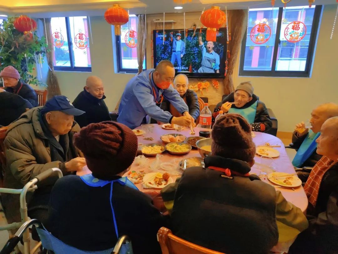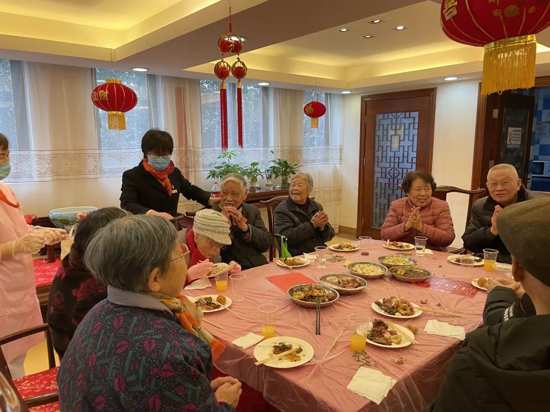 饭菜送上桌,老人们围坐在大红圆桌旁热热闹闹地吃着饭,清蒸桂鱼,寓意年年有余;糖醋小骨,寓意节节高升;酒酿圆子,寓意团团圆圆……一个个温馨、有爱的画面让年味更加浓郁。老人们不仅品尝到了家的味道,也为新一年讨了一个好彩头。