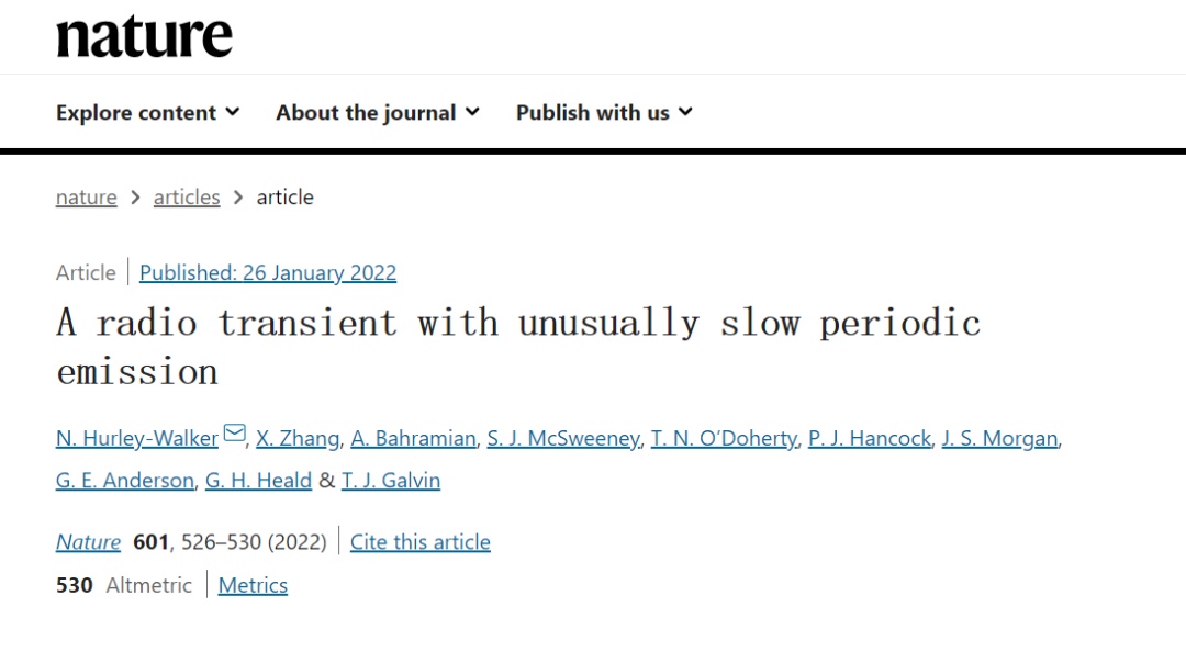 上海天文台的张翔助理研究员与Hurley-Walker博士等通过分析位于澳洲的SKA低频先导望远镜默奇森宽场阵列(Murchison Widefield Array,MWA)的巡天观测数据,发现了一个具有异常缓慢周期性辐射的致密暂现源。这颗暂现源于2018年初出现,其爆发周期约为18分钟左右,比已知的最长的脉冲星爆发周期长9倍,每次爆发持续30-60秒左右,也包括短时标(<0.5秒)的爆发,而在更多情况下,观察到的是比较平滑的以小时为单位演变的轮廓,在爆发期间,它是150 MHz波段南天最明亮的30个射电源之一。