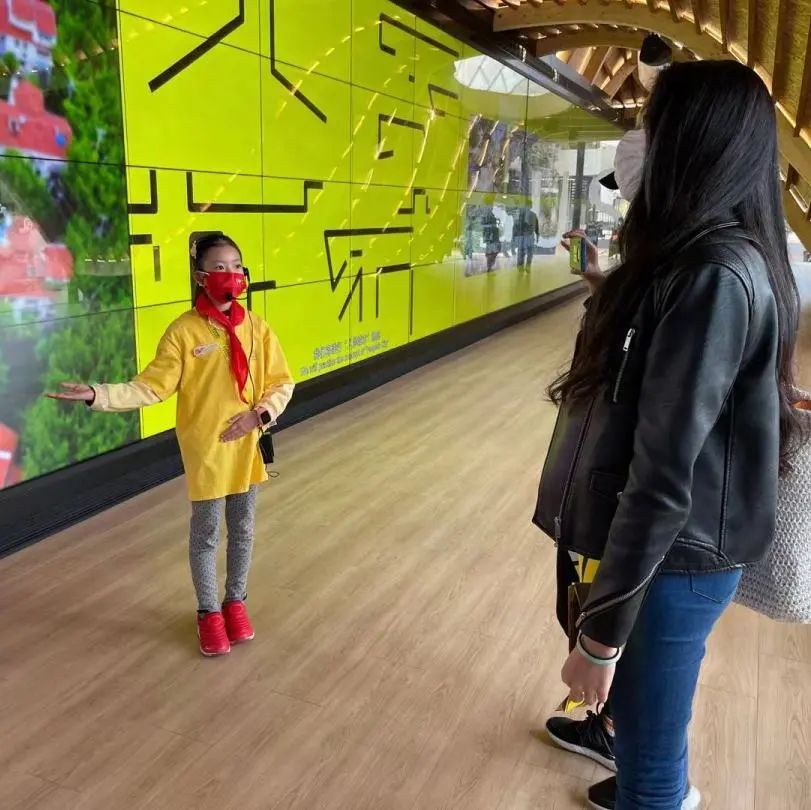 我回过神一抬头,看见一对父母牵着自己的两个小孩走进了展馆,我迎上前:“我是这里的小小导赏员,请问需要我为你们导览吗?”父亲点了点头,转身抱起了一个小孩指着墙上的图片说:“你看,这个地方是不是很漂亮?”