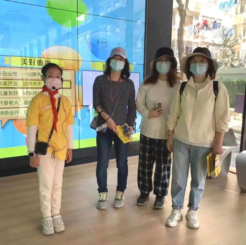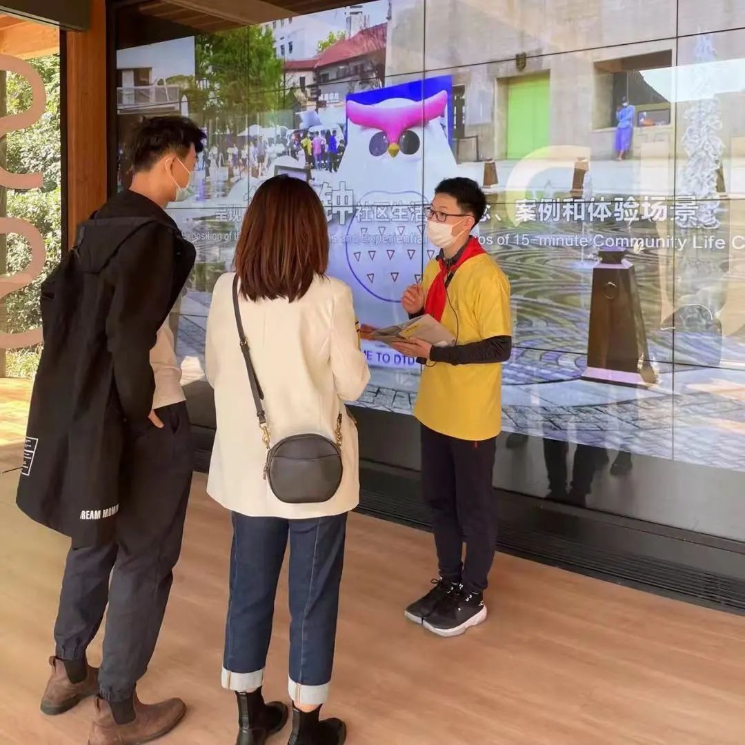我为了更好地准备演讲,多次前往上升新所,深入了解场地和环境,并主动查询“五宜”、“六共机制”相关知识,希望能用自己的语言向大众讲述“15分钟社区生活圈”;还记得第一天讲解,有位热心的叔叔看到我咳嗽,关心地让我要多喝水,有位亲切的奶奶给予我鼓励说会更好的;慢慢地我从开始上岗的害羞懵懂,到后面主动出击站在门外拉人,提供导览服务。