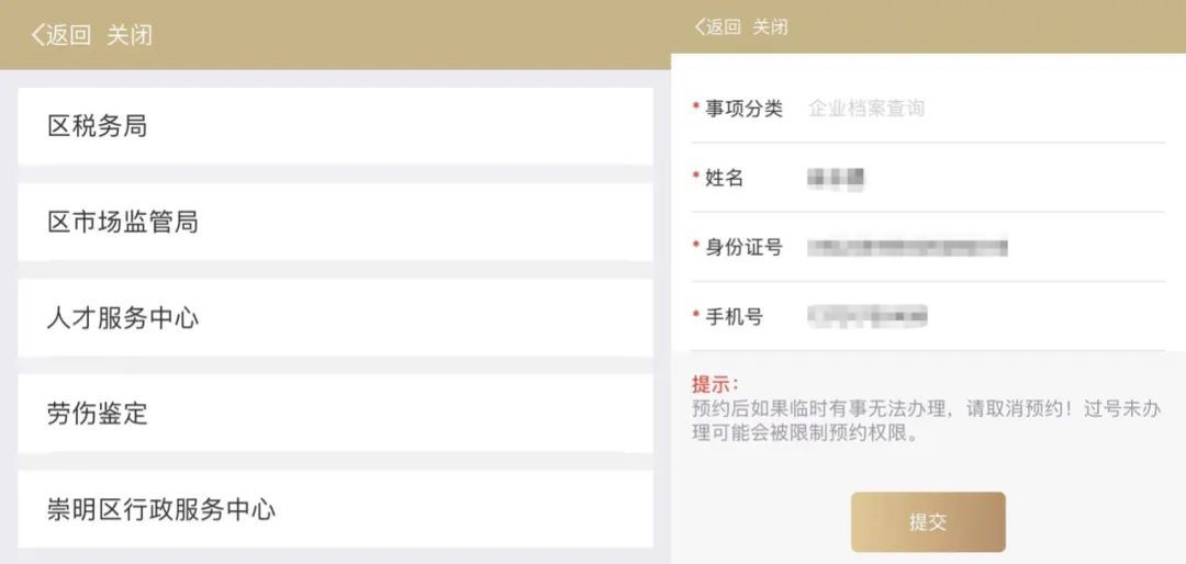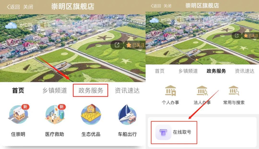用户可通过“随申办”APP、微信及支付宝小程序,搜索“崇明旗舰店”,点击进入后,在“政务服务”频道获取在线取号服务,选择需要办理的事项类型并确认姓名、身份证号、手机号等基本信息无误后,点击“提交”即可完成取号。