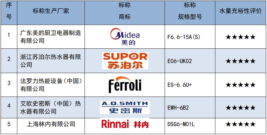 其中有5件样品的洗手水量在15升以上,显示水量充裕,标称商标(规格型号)分别是:史密斯(EWH-6B2)、美的(F6.6-15A(S))、林内(DSG6-M01L)、苏泊尔(E06-UK02)、法罗力(ES-6.6U+)。