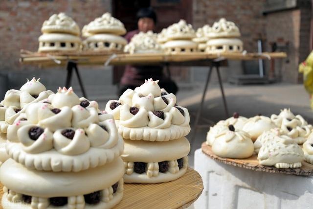 花糕(高)的寓意很深刻,寓意步步登高,生活越来越好。过年送人花糕做礼物是很重的礼节,一般都是长辈送给小辈,祈盼小辈的生活更红火。枣花糕形状繁多,以面作圆底盘,卷条边缘为纹,铺一层红枣,上面再加上一层比第一层略小的带花边的面盘,上面可做上各种不同寓意的吉祥饰物,为生活中找到自己美好的愿望和精神寄托。