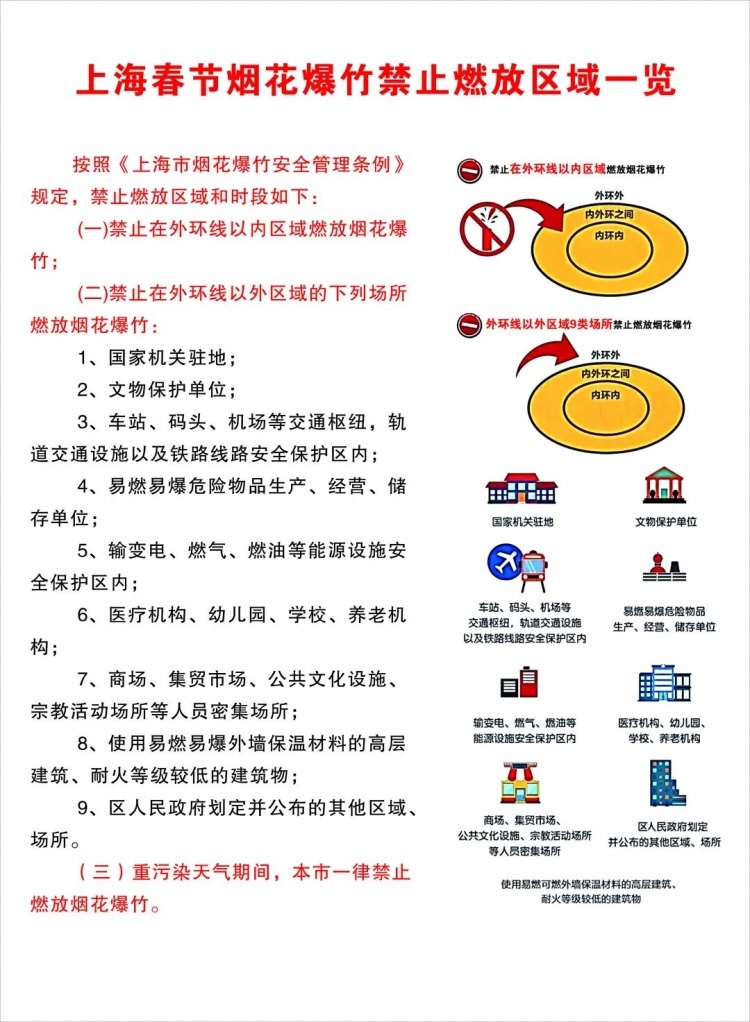 2.2022年1月31日、2月4日、2月15日等时段,全面加强烟花爆竹安全管控工作。严格根据《上海市烟花爆竹安全管理条例》划定的禁放区域,依法及时劝阻、制止、查处非法燃放行为,对不听劝阻、违法燃放的,依法从严处罚,并通过媒体予以曝光。