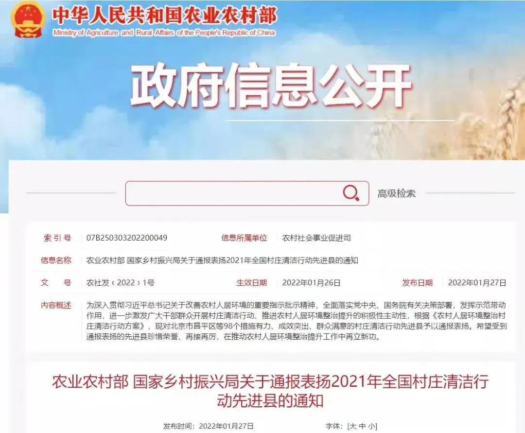 为发挥示范带动作用,进一步激发广大干部群众开展村庄清洁行动、推进农村人居环境整治提升的积极性主动性,农业农村部、国家乡村振兴局日前印发《关于通报表扬2021年全国村庄清洁行动先进县的通知》(以下简称《通知》),对北京市昌平区等98个措施有力、成效突出、群众满意的村庄清洁行动先进县予以通报表扬。