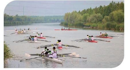 2021 年浦东新区学生阳光体育大联赛青少年赛艇挑战赛在上海国际旅游度假区举行,来自浦东100 所中小学的百支团队劈波斩浪、奋勇争先。川迪北河,百舸争流,小运动员们全力划桨,一艘艘红色、黄色的赛艇向着终点进发。