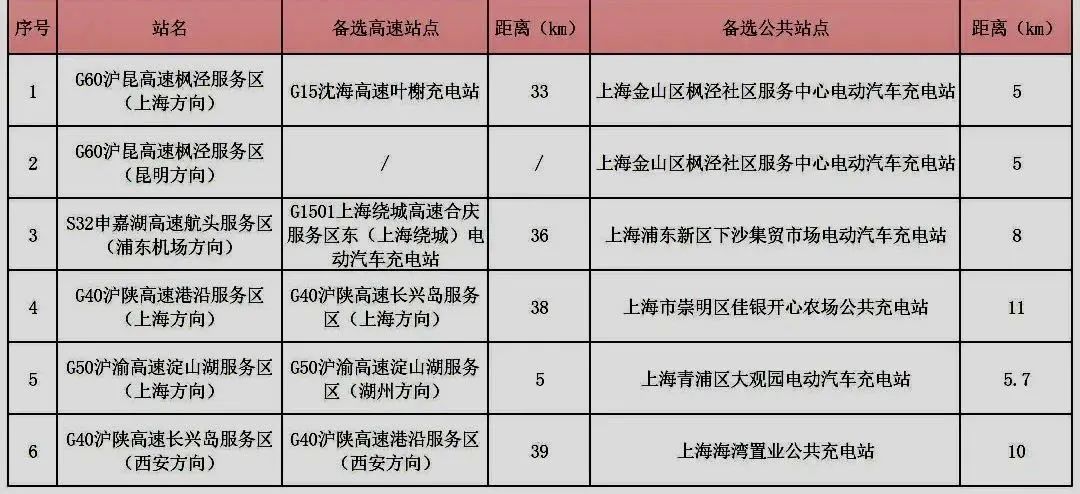 | 13 | G50沪渝高速 | 淀山湖服务区(上海方向)电动汽车充电站 |