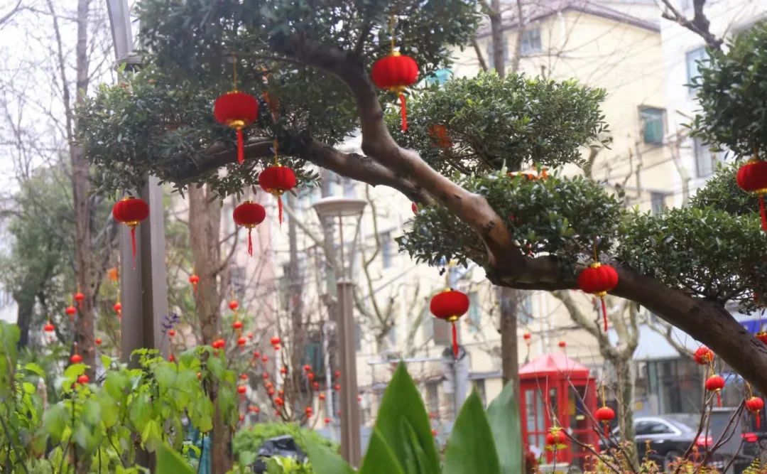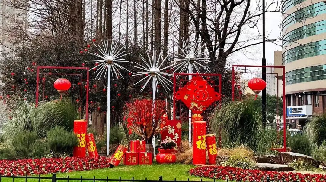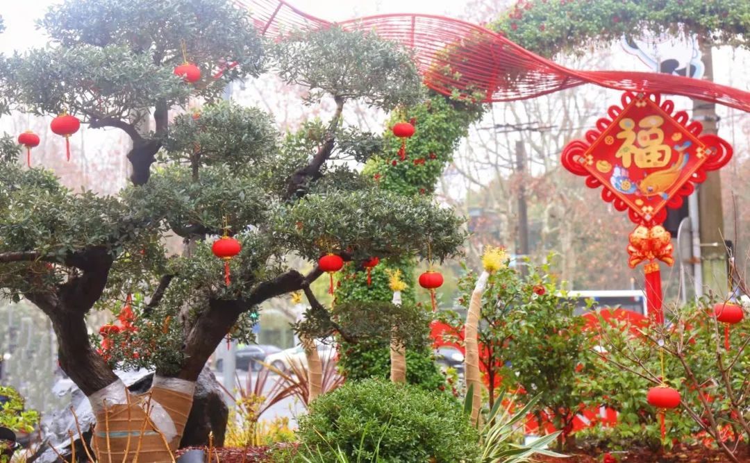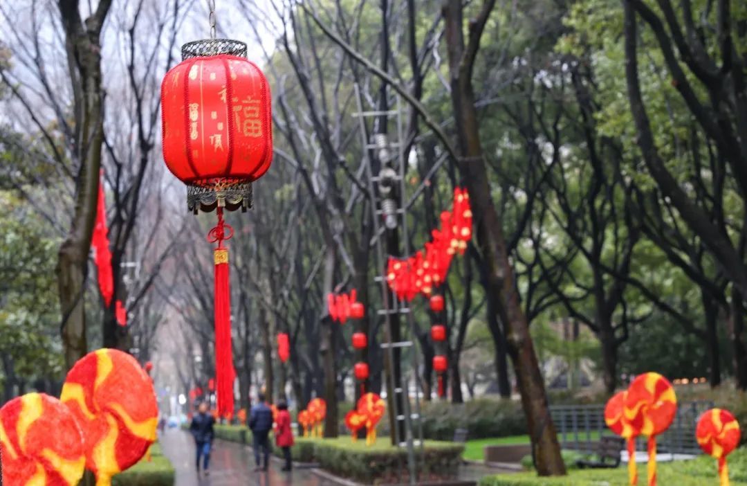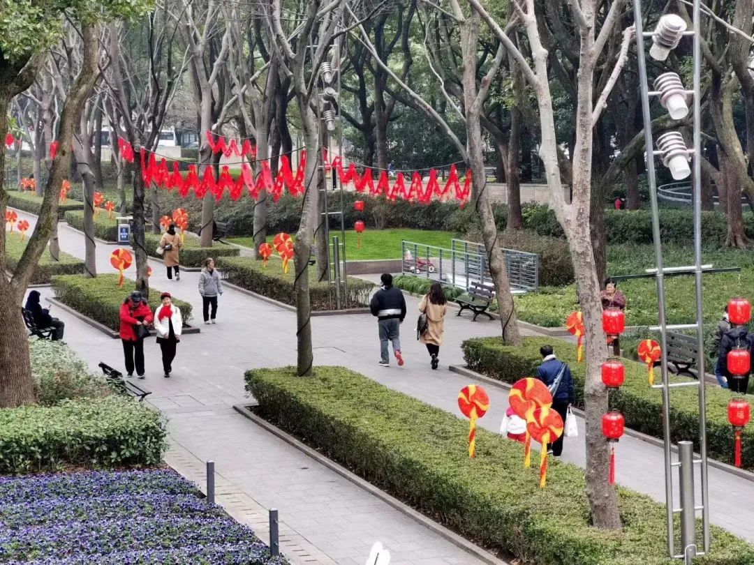 徐汇各大公园通过悬挂灯笼、放置中国结、福字小品等,形成一园一景,全方位提升徐汇年味。