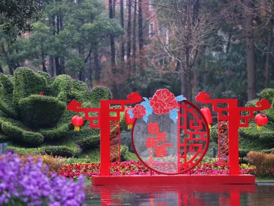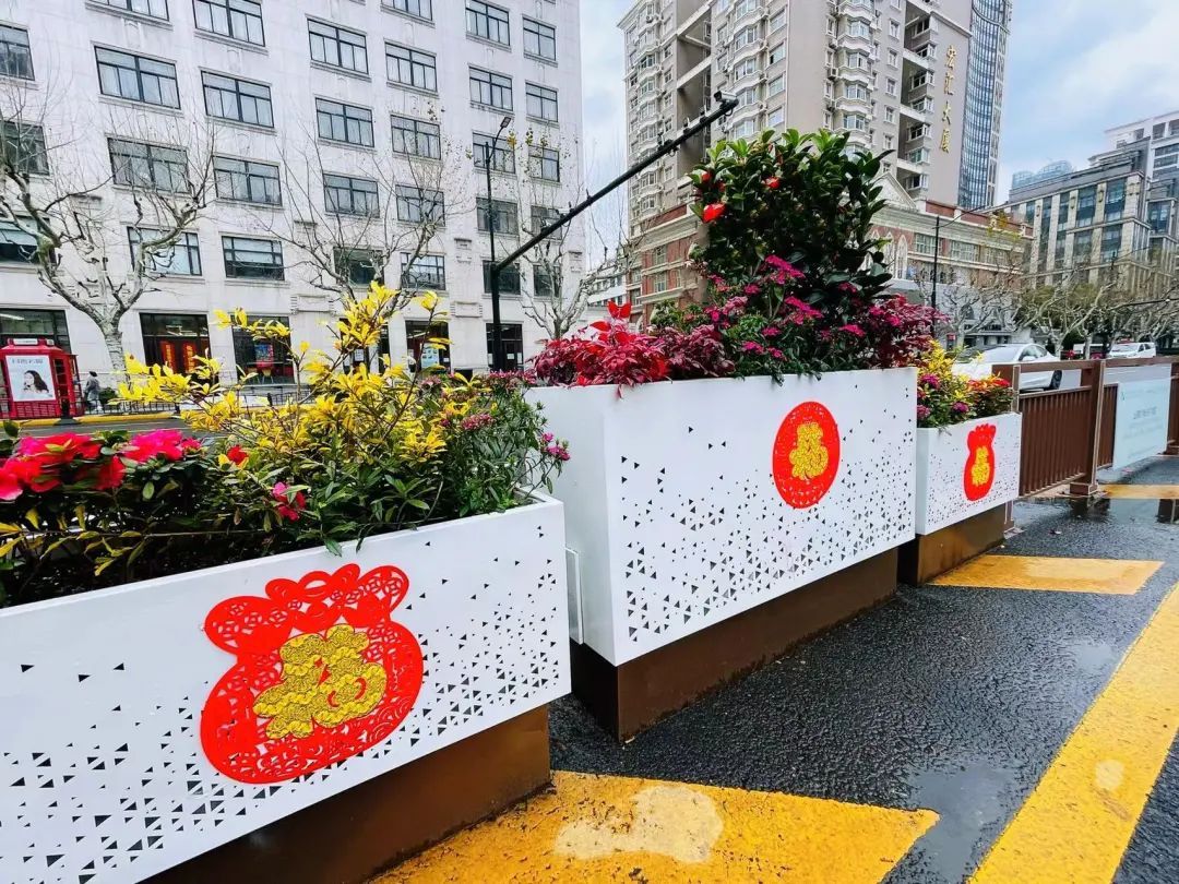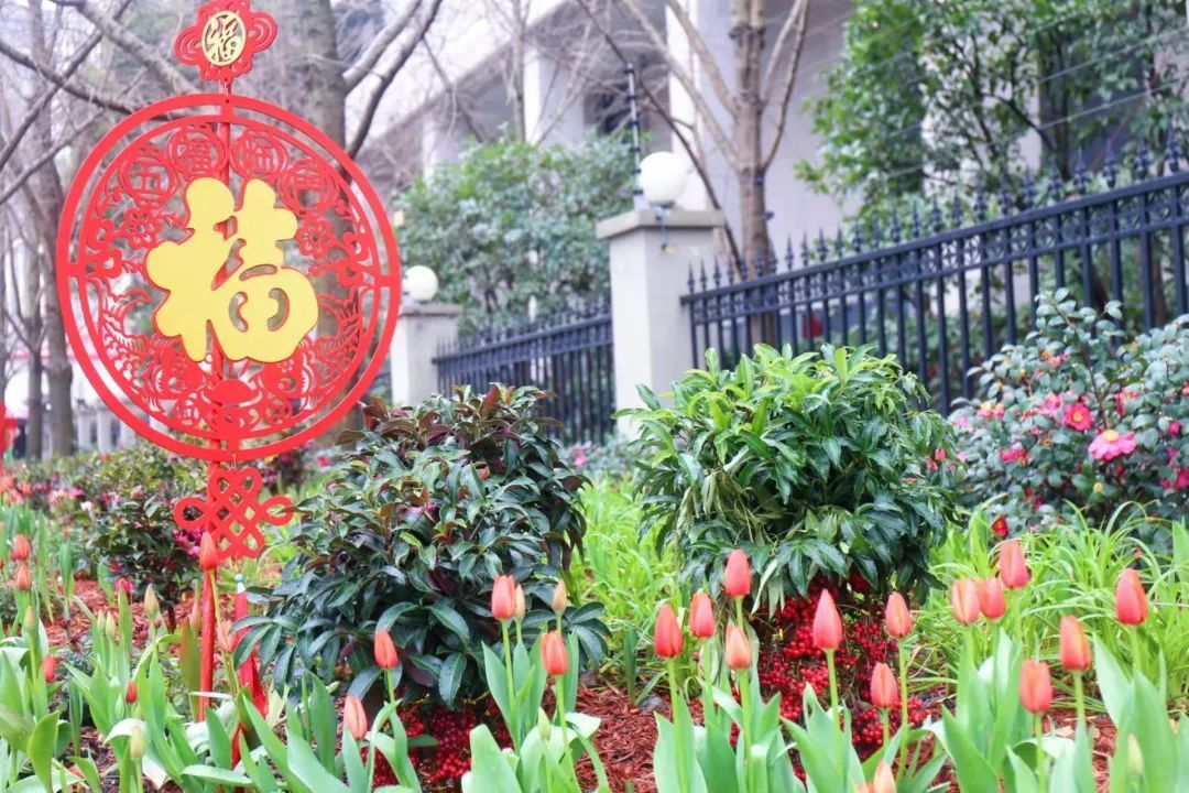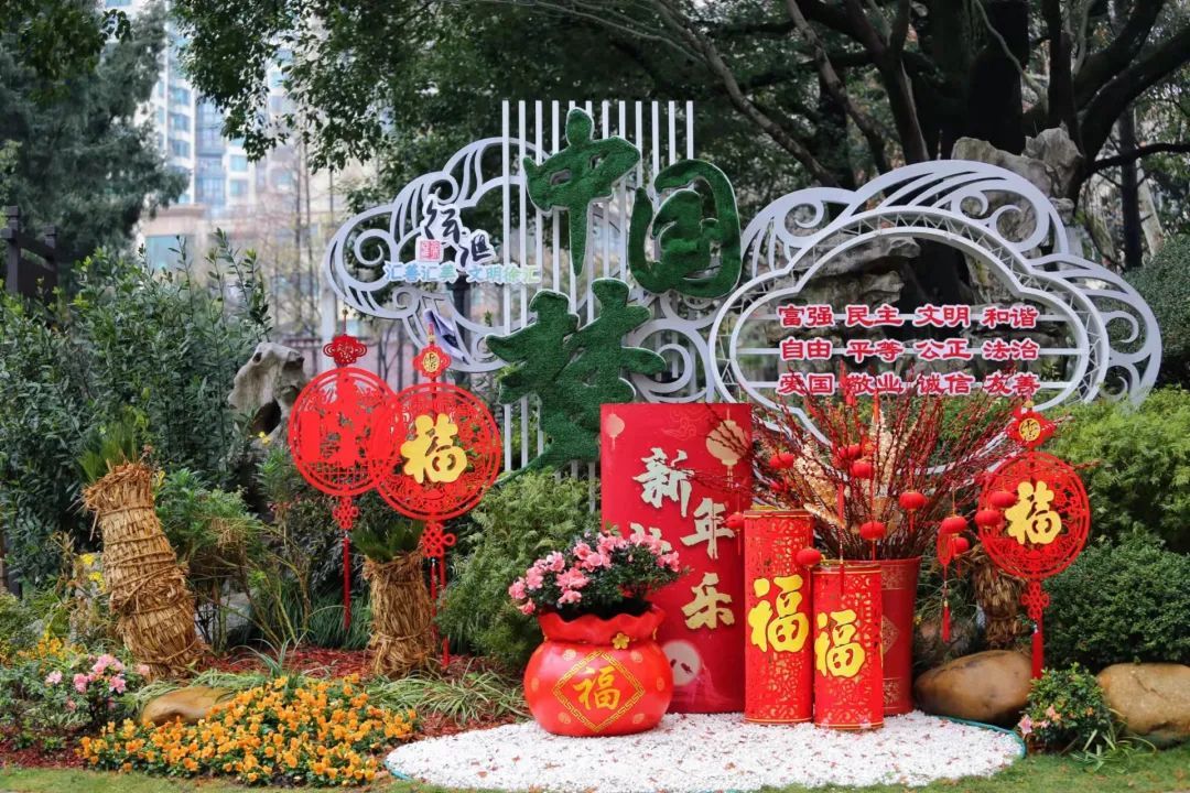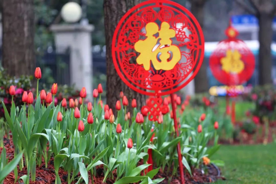 徐汇各大公园通过悬挂灯笼、放置中国结、福字小品等,形成一园一景,全方位提升徐汇年味。