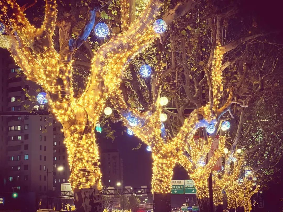 在漕溪北路两侧行道树使用灯带和灯球等进行亮化布置,点亮属于徐汇的“星光大道”。