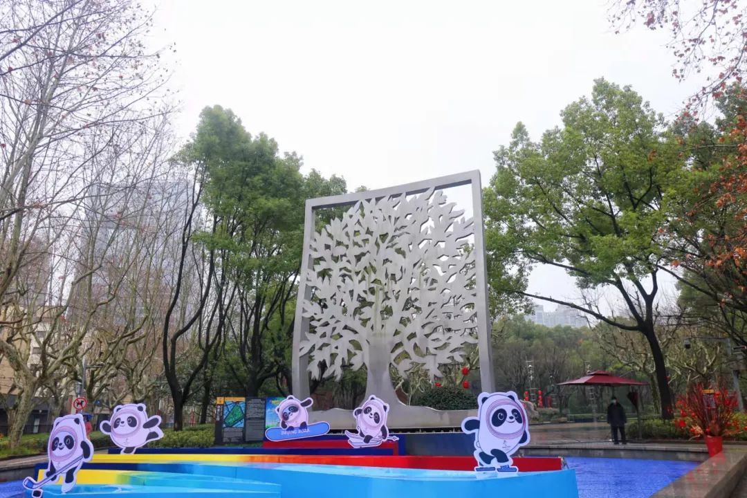 华山路淮海路绿地结合山水绿化造型,配以冬奥会吉祥物“冰墩墩、雪容融”,添加了“高山滑雪”景观小品,还原了这一比赛项目的动感与魅力。