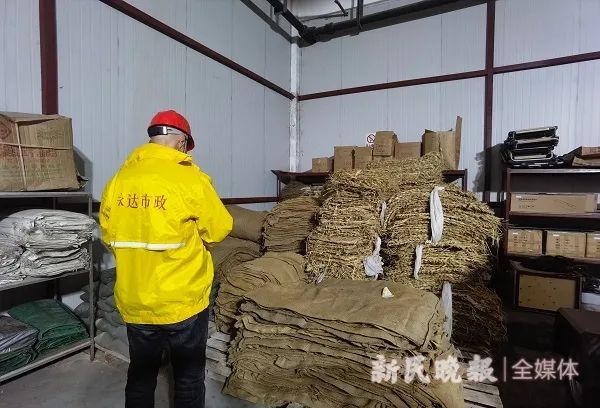 图说:永达市政工作人员在清点稻草垫、麻袋等应急物资