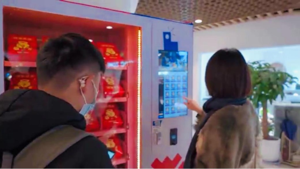 一对母子正在盲盒机前捐赠