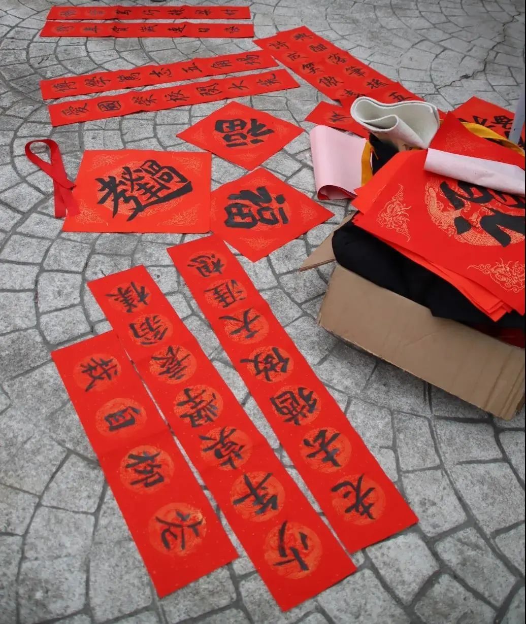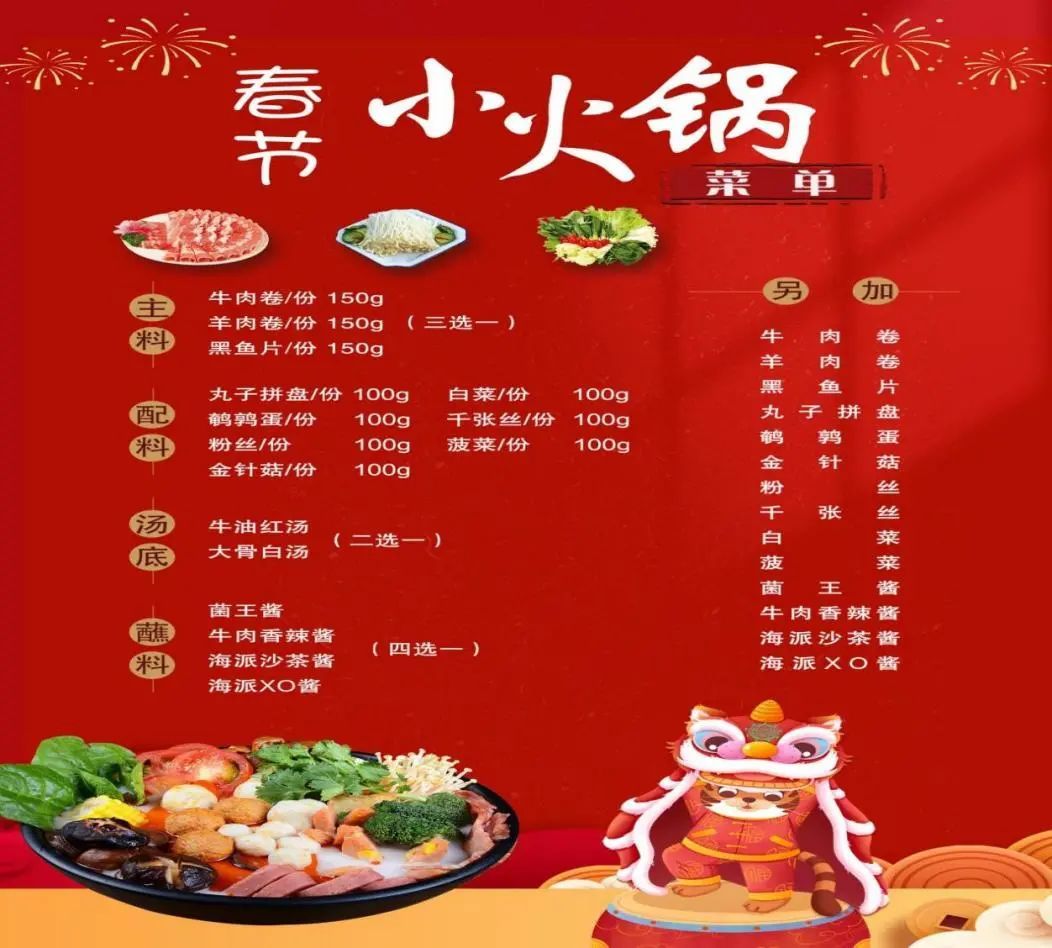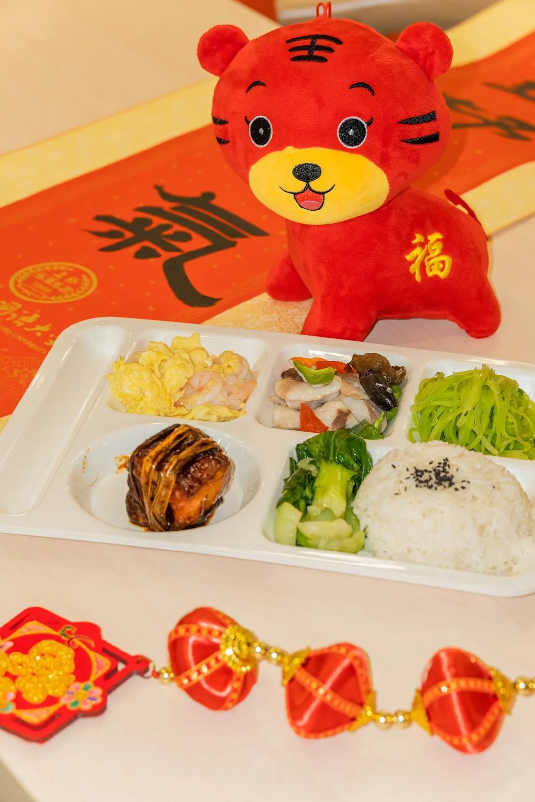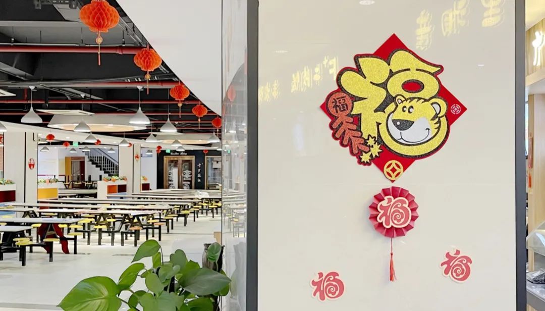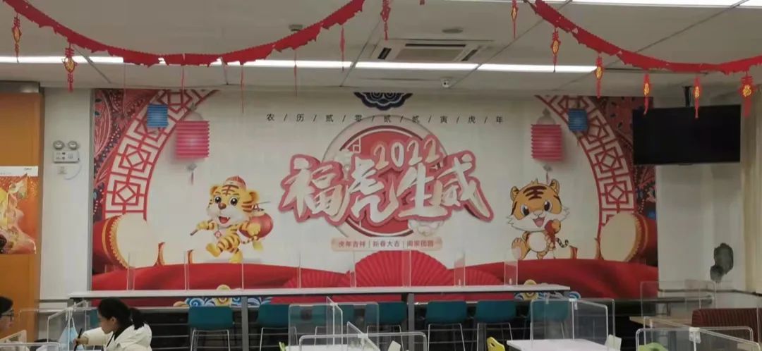 学校在各校区开放餐厅里挂上了大红灯笼,在玻璃窗上贴上了寓意平安喜乐的窗花,还在餐厅各个窗口摆上了传统的布艺小老虎,在整个餐厅营造出了喜庆欢乐的新年气氛。除了餐厅氛围的营造,闵行餐饮部也对春节期间食堂菜单进行了认真设计。为留校师生开设了热力小火锅,荤素搭配、口味多样、价格适中,在除夕夜还赠送水饺一份,让留校的同学们涮着火锅,吃着饺子,开开心心过新年。另外还增加了现点现烧的小炒菜,增加了汤圆、红油抄手等品种,丰富了同学的节日餐桌。生活园区则与书画篆刻协会合作,为寝室楼栋书写了专属定制春联。
