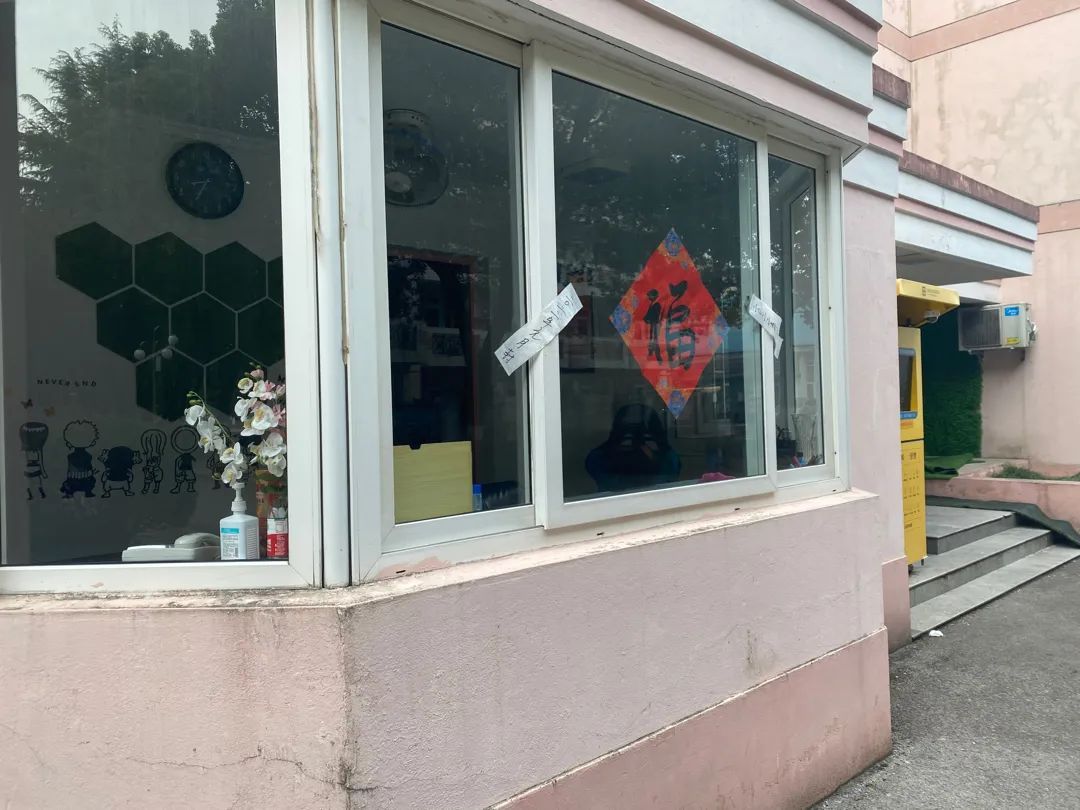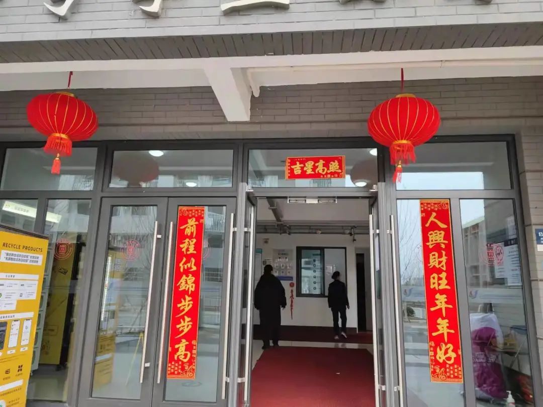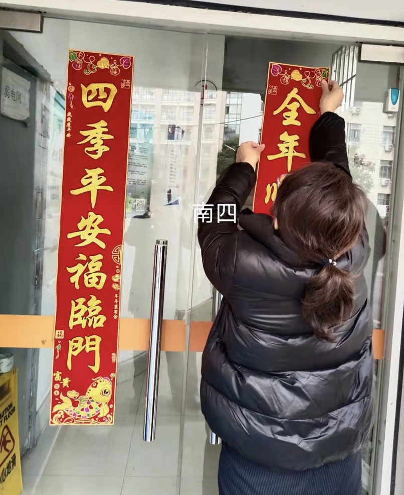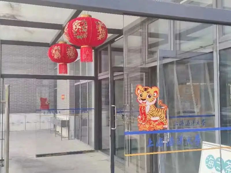 在农历新年来临之际,华东理工大学学生公寓门口贴上了吉祥对联,挂上了大红灯笼、门廊上还有窗花和迎新小摆件,一派新年喜庆的氛围。