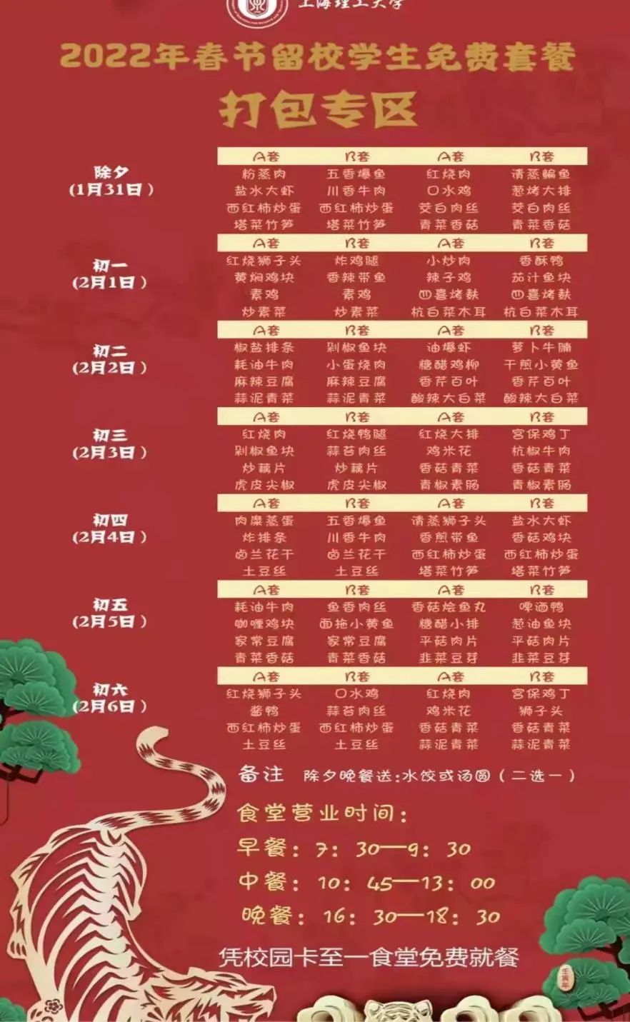 除夕当晚,复旦大学各校区食堂将开放,供留校师生观看春节联欢晚会,现场供应免费小零食,还可以制作水饺、汤圆。除夕和大年初一、初二的早中晚三餐提供“一分钱”年夜饭,师生只需凭卡消费1分钱,即可享用新年美食。同时准备了丰富的活动,包括幸运大转盘、好运签等你来、新年红包等,陪伴留校师生一起过一个圆满的春节。