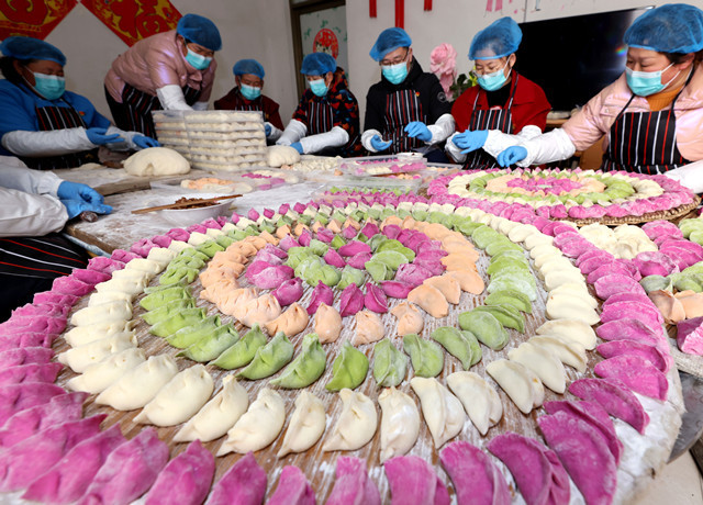 1月29日,山东省枣庄市马兰屯镇南洛村党员志愿者和部分村民一起为村里的空巢老人、孤寡老人包“彩色饺子”。