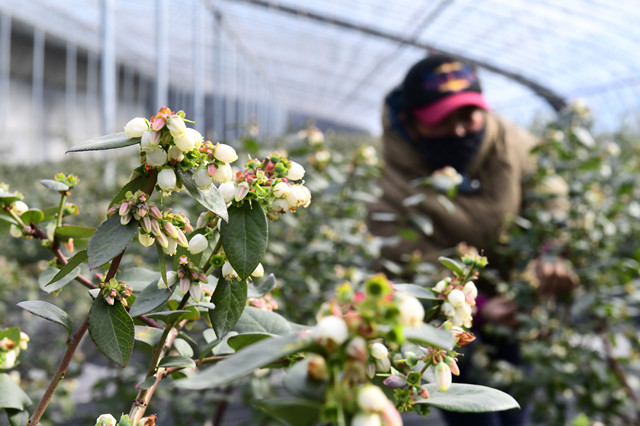 1月28日,村民在日照市东港区陈疃镇蓝莓产业园温室大棚里管护蓝莓。