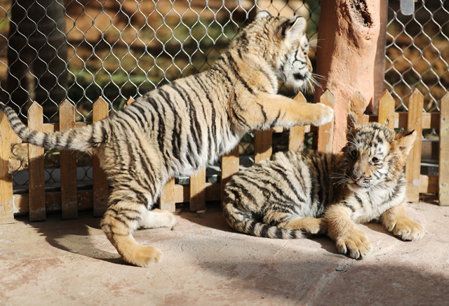 1月29日,在青岛森林野生动物世界,两只小老虎在嬉戏。