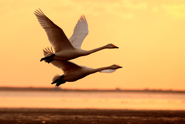 1月29日,在山东省荣成市成山大天鹅自然保护区天鹅湖,天鹅在晨曦中飞舞。新华社发(杨志礼摄)