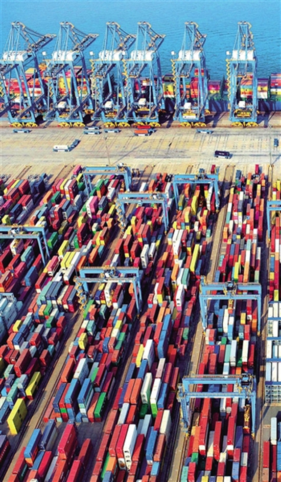 近日,在山东港口青岛港全自动化码头,集装箱堆场一派繁忙。青岛港2021年完成货物吞吐量6.3亿吨,同比增长4.3%;完成集装箱吞吐量2371万标箱,同比增长7.8%。张进刚摄(经济日报1月27日1版)
