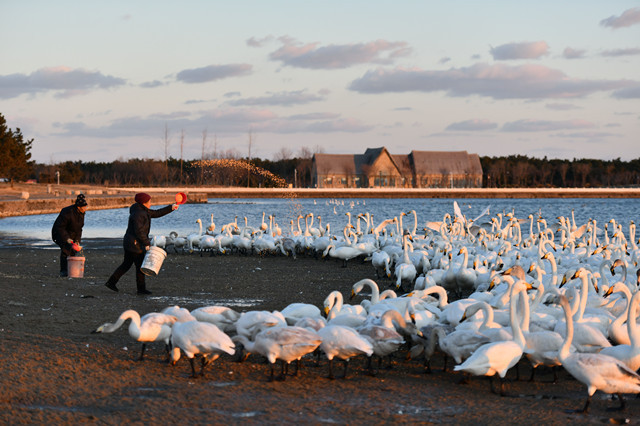在山东省荣成大天鹅国家级自然保护区,刘志斌(左)和老伴赵淑珍为过冬的大天鹅补充食物(1月17日摄)。新华社记者 徐速绘 摄