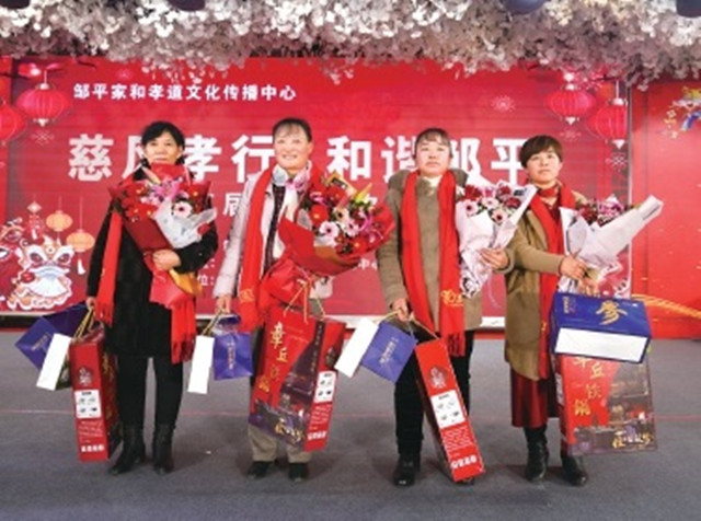 新春佳节来临之际,山东省邹平市围绕“百善孝为先,以孝行天下”为主题举办了一场“春晚”。图为在晚会上受到表彰的“最美婆婆”和“最美媳妇”,4名获奖者都来自当地的农村。董乃德摄(农民日报1月25日5版)