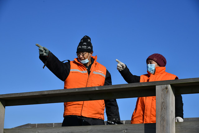 在山东省荣成大天鹅国家级自然保护区,刘志斌(左)和老伴赵淑珍在观察栖息在这里的大天鹅(1月18日摄)。新华社记者 徐速绘 摄