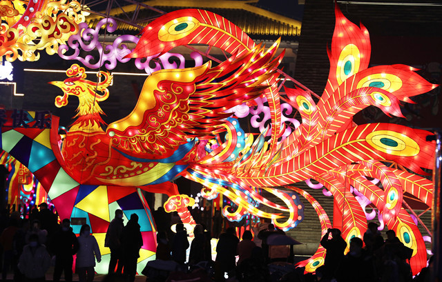 1月30日晚,游客在山东省临沂市郯城县郯国古城景区观赏彩灯。