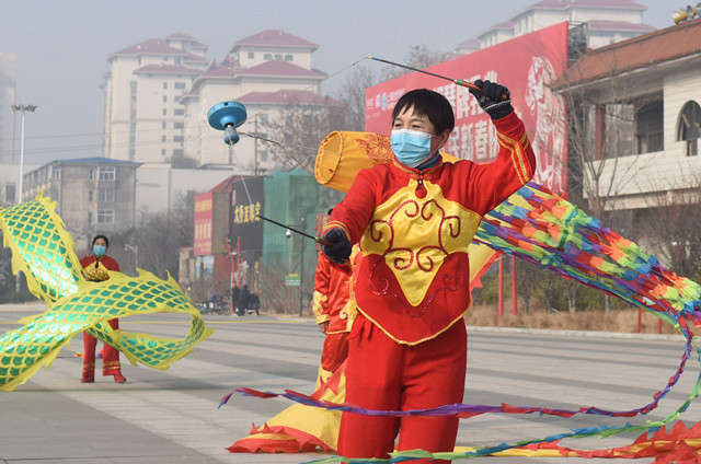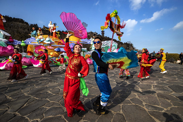 1月29日,山东省烟台市蓬莱阁风景区民间艺人在表演秧歌。