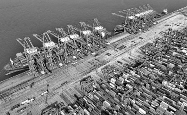 日前,交通运输部发布数据显示:山东港口青岛港2021年完成货物吞吐量6.3亿吨,同比增长4.3%;完成集装箱吞吐量2371万标箱,同比增长7.8%,货物吞吐量和集装箱吞吐量实现双增长。图为1月21日,青岛港全自动化码头前沿一派繁忙景象。张进刚摄(光明日报1月24日3版)