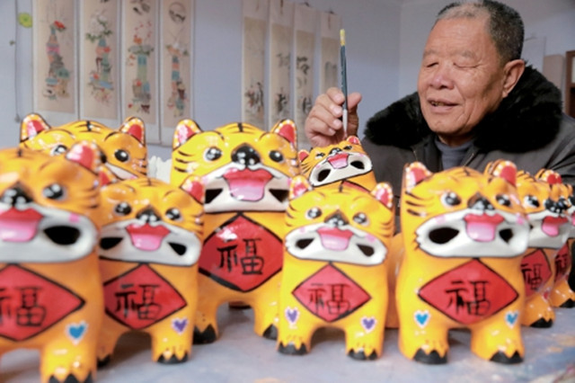 1月25日,山东省高密市姜庄镇聂家庄村一泥塑作坊内,泥塑艺人正忙着给“泥叫虎”绘制上色。临近虎年春节,聂家庄村虎元素的泥塑“泥叫虎”迎来了销售旺年,虎头虎脑、神气十足的小泥老虎供不应求,泥塑艺人们正加班加点赶制春节订单。李海涛 王喜进摄(农民日报1月30日1版)