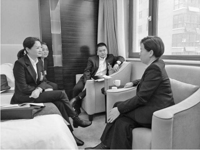 1月22日,山东省莘县政协十三届一次会议开幕式后,工青妇界委员文珊珊、冯国秀、王国栋、虞改雪(从左到右)聚在一起讨论交流常委会工作报告、提案工作报告以及2022年协商工作计划。牛恩红摄( 人民政协报1月24日6版)