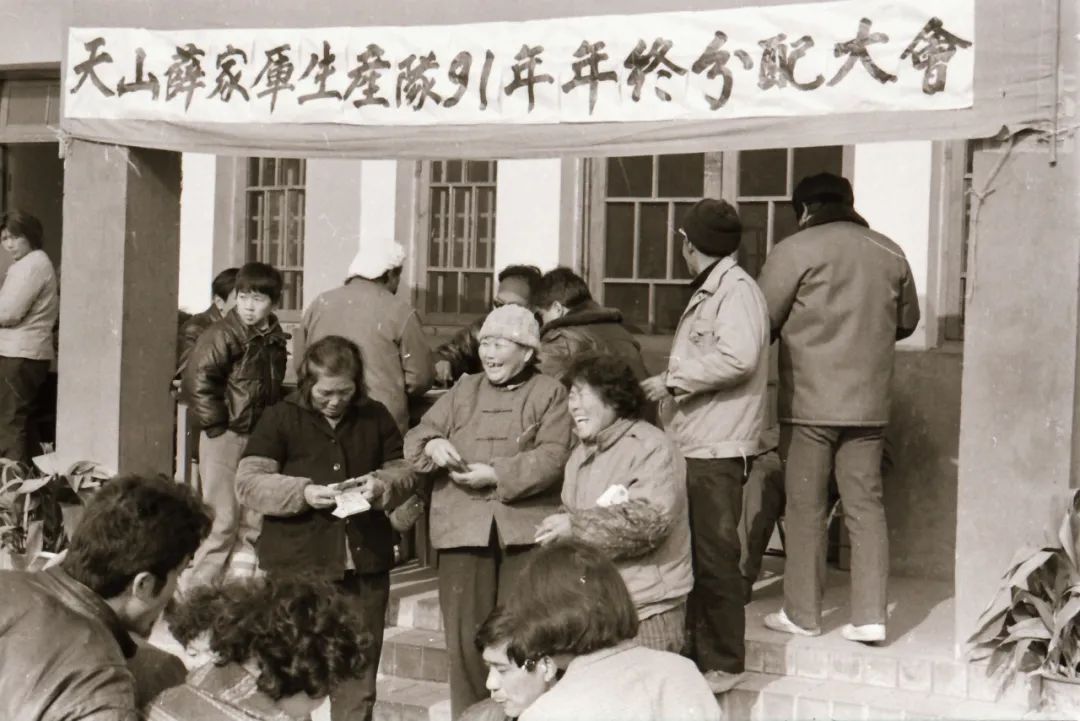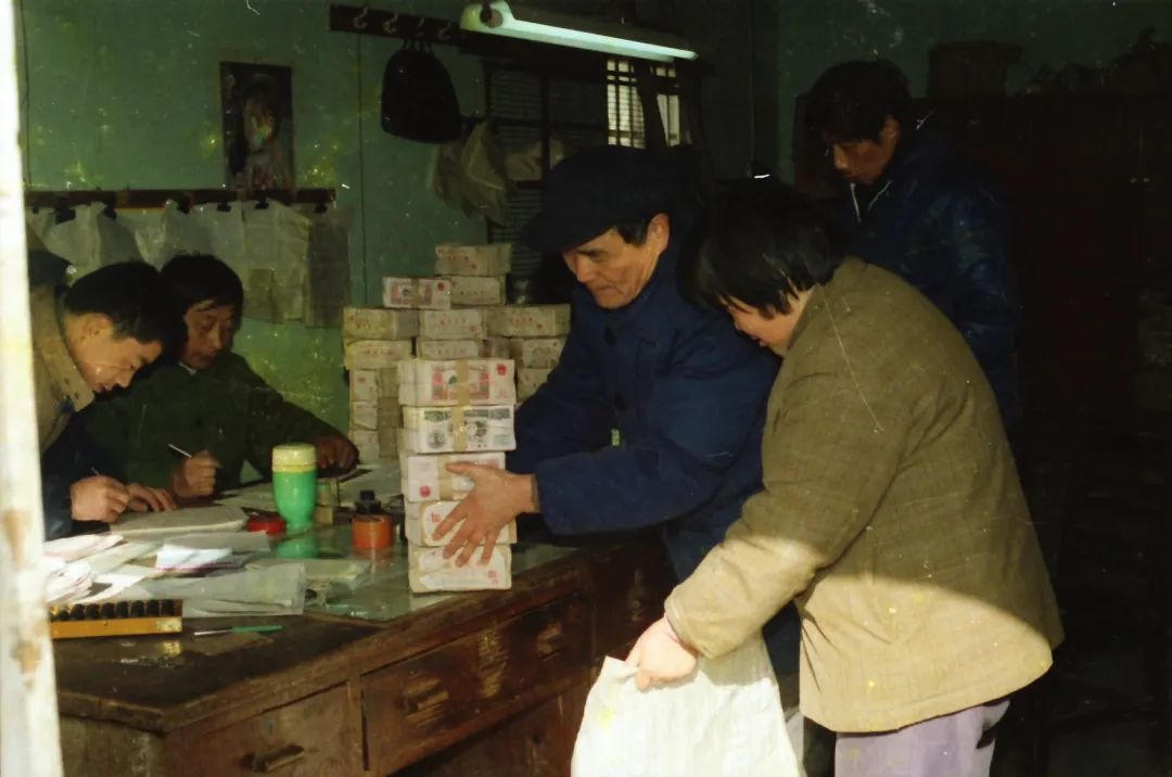 1980年代程桥村年终分红,社员用化纤袋装分红款