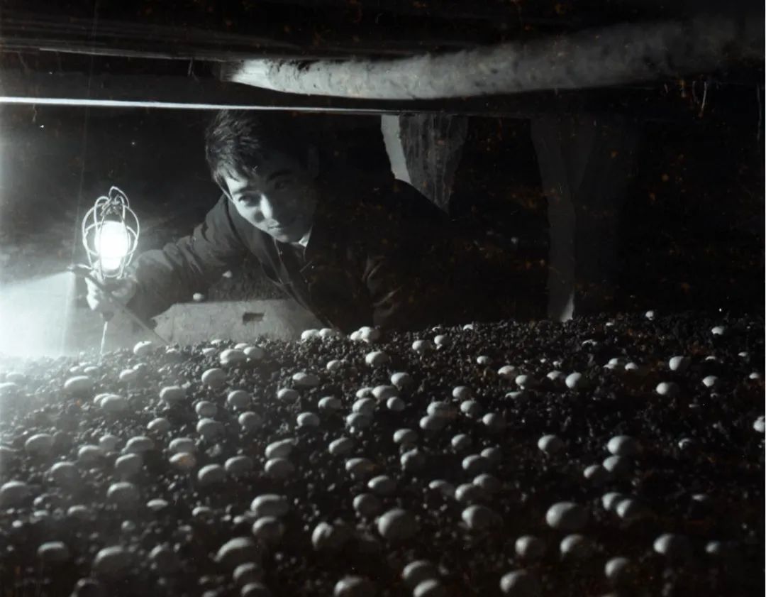 1970年代薛家厍生产队技术员观察蘑菇长势