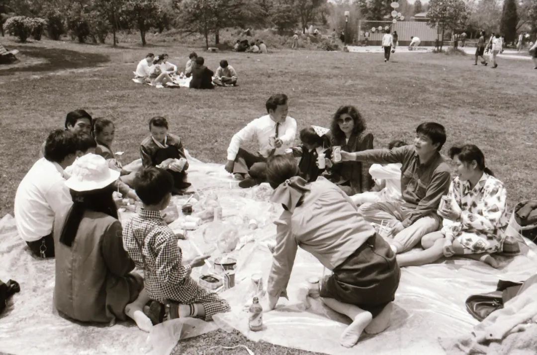 1990年代初富裕起来的新泾青年农民在上海植物园草坪上休闲度假