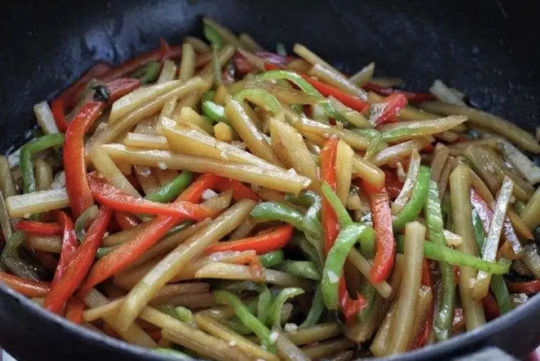 3、锅内加油,肉丝入锅翻炒,加入豆腐干、木耳、黄花菜一起翻炒均匀