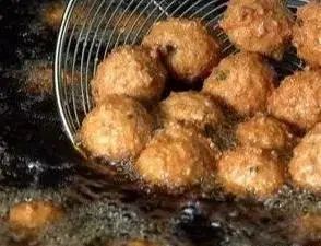 6、将搓好的糯米圆子,放至5至6成热的油中炸,炸到金黄色的时候捞出