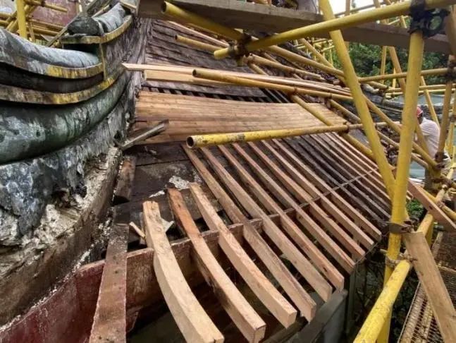 由于年久失修,花园内的很多亭子的结构、屋面、立面、亭内墙地面、细部装饰等都出现不同程度的损坏。在不破坏亭子整体结构的情况下,施工人员对损坏的局部进行了修缮,更换腐朽的椽子,修补亭顶,并为亭子重新上漆。