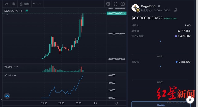 据财联社,Avedex交易所数据显示,DogeKing币价由0.000000000007美元短线拉升至0.00000000372美元,24小时交易量达46万美元。