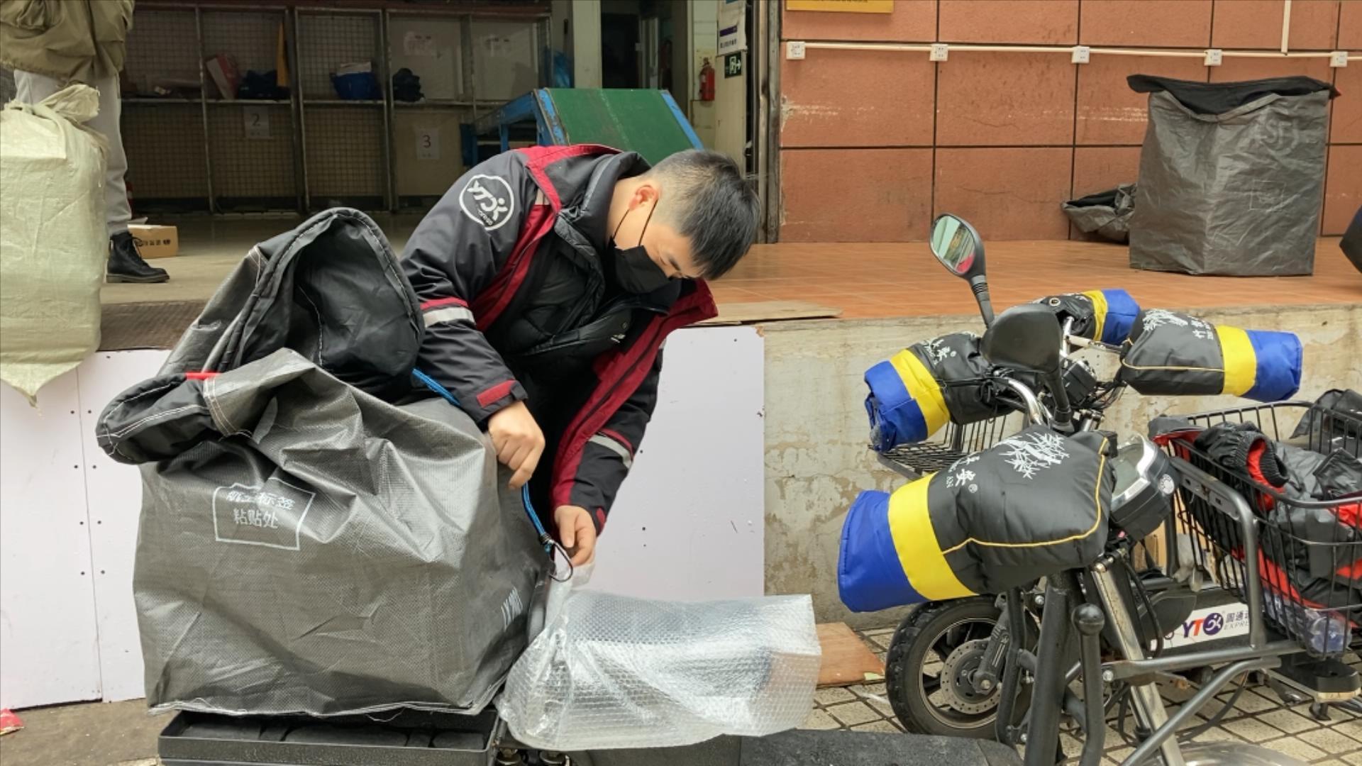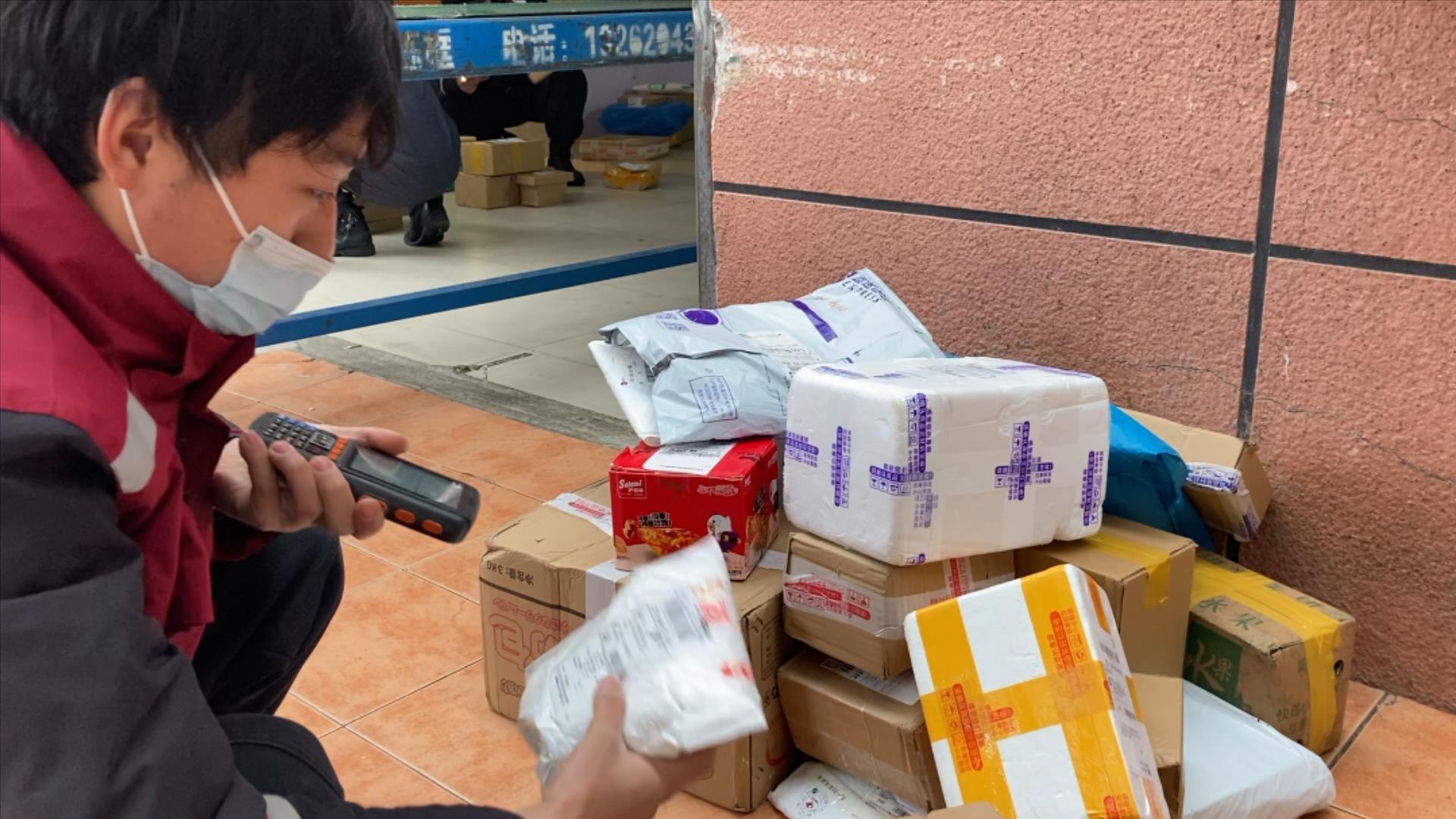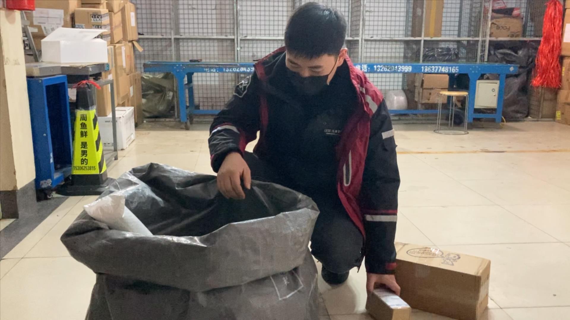 来自安徽阜阳、30岁的朱文浩正在仔细分拣着快递,今年是他第二年春节值班,因为疫情原因,他选择留下来值守。