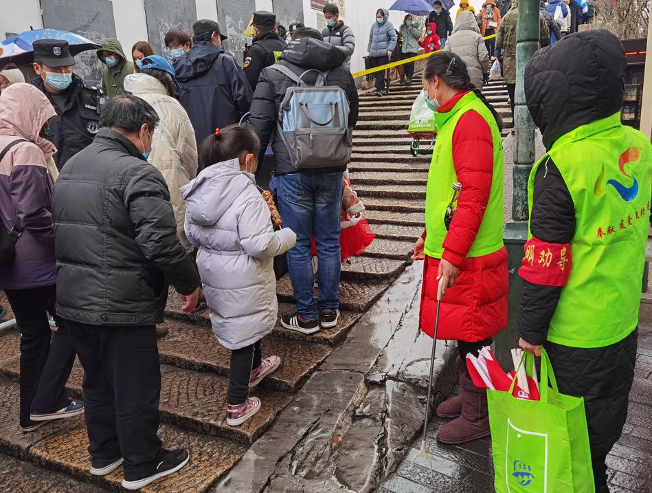 “小朋友,要文明旅游,请戴好口罩。”景区内,疫情防控组的志愿者们会不间断巡查,提醒游客正确佩戴口罩,同时还会送给游客限量的小老虎饰品,既提醒游客文明旅游,也送上新春的祝福。
