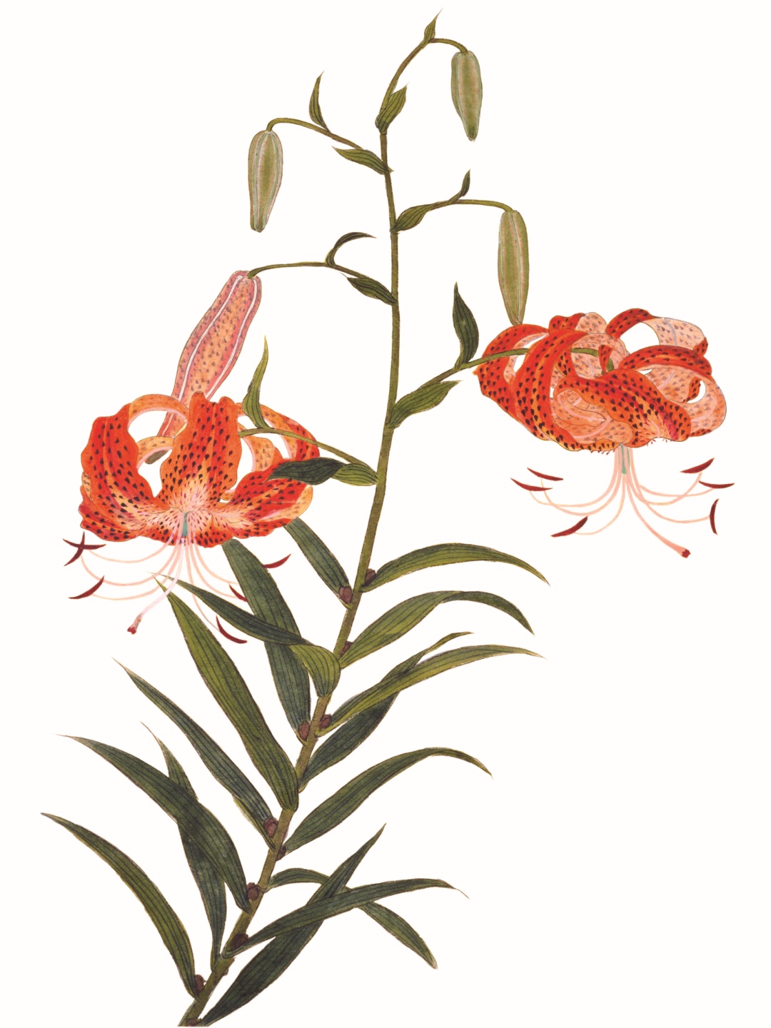 卷丹之名,得于其形:色如丹,瓣反卷,洒黑斑。如任由卷丹随意生长,据说它会生得植株高大,大花繁多垂挂,花瓣张牙舞爪,黑斑引人注目。细思那番景象,当真是极富气势,十足女王范了。