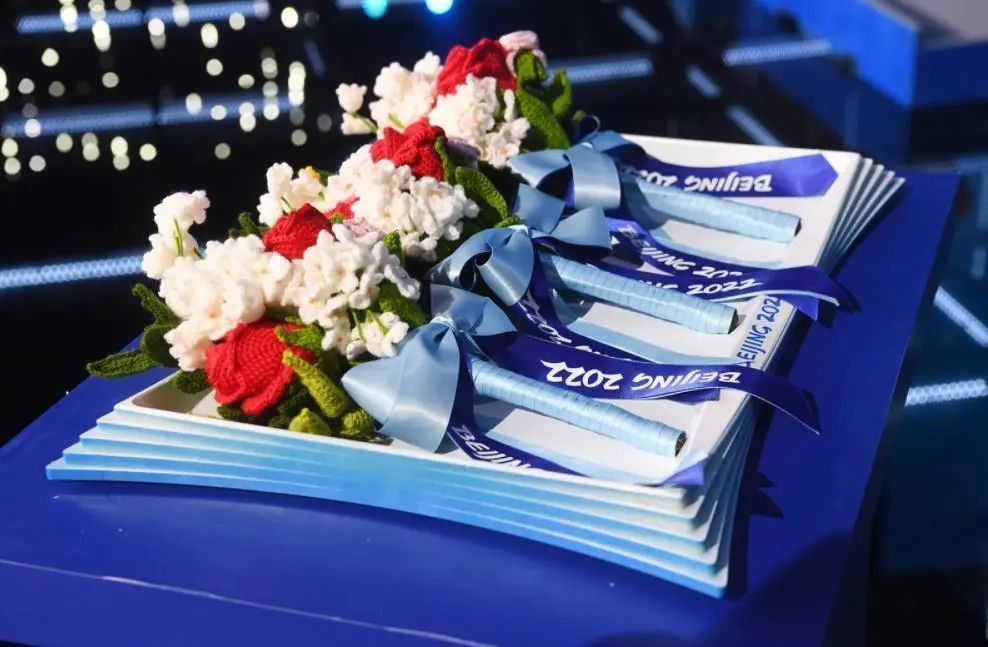 秉承“绿色、共享、开放、廉洁”办赛理念,北京冬奥会和冬残奥会颁奖花束采用的是永不凋谢、低碳环保的绒线花束。花束包括玫瑰、月季、铃兰、绣球、月桂、橄榄、波斯菊等花材,其中象征和平的橄榄,就是由奉贤区海湾镇“兰韵悦唐”线艺编织班参与编织的。