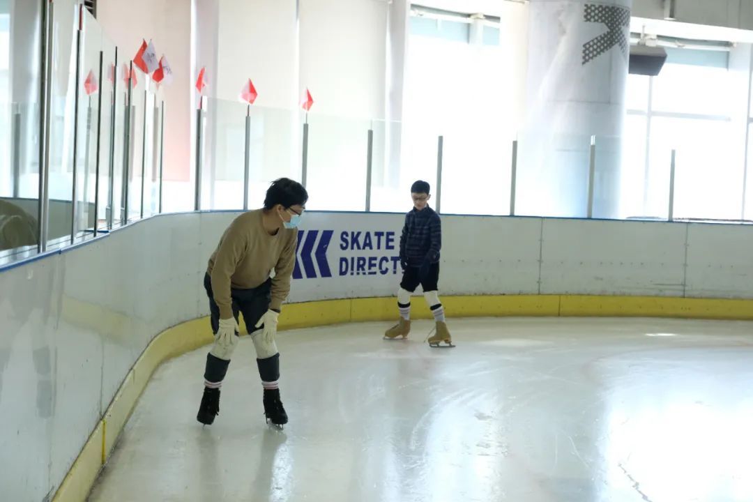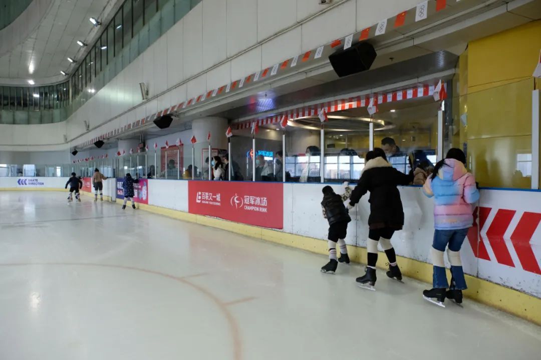 上午10点,在位于百联又一城的冠军冰场,不少市民正在此享受冰雪运动的速度与激情,资深爱好者们穿上冰刀豪情纵横,在冰面上划过一道道完美的弧线;新手们扶着墙蹒跚学步,即便摔了好几跤,也大呼过瘾。