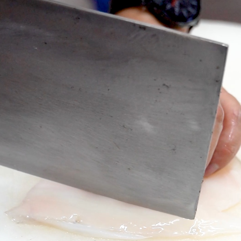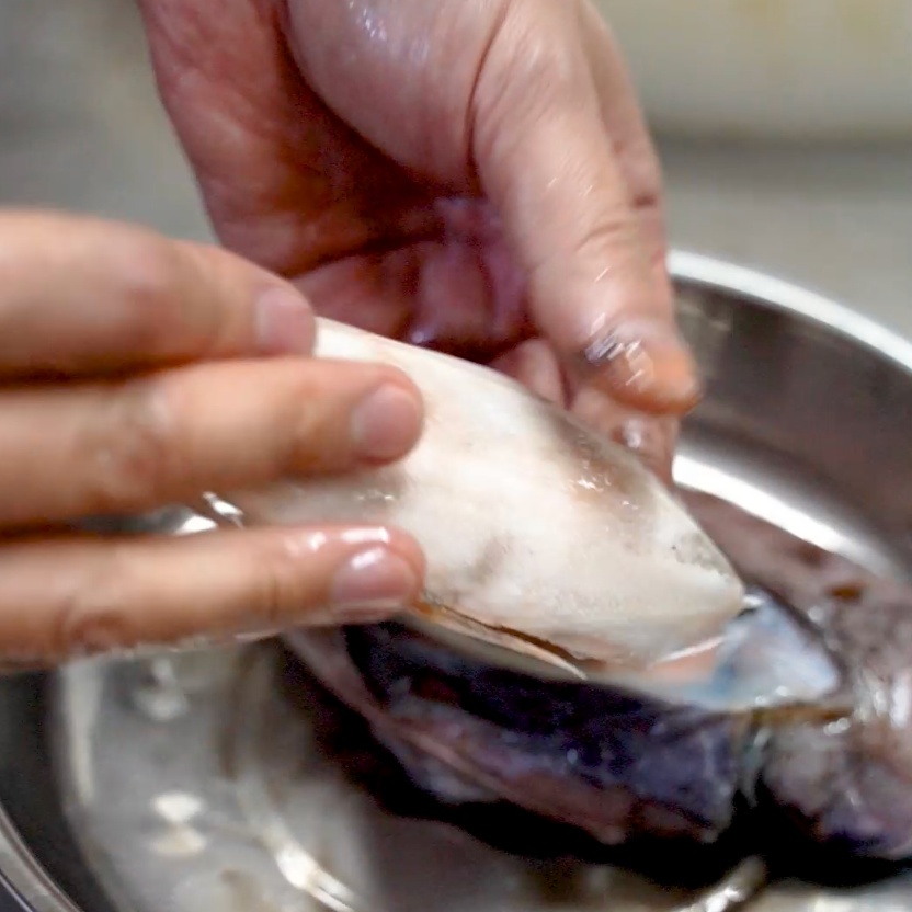 2. 去掉内脏,外皮剥干净,剩下白白胖胖的一块墨鱼肉;